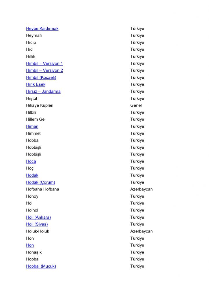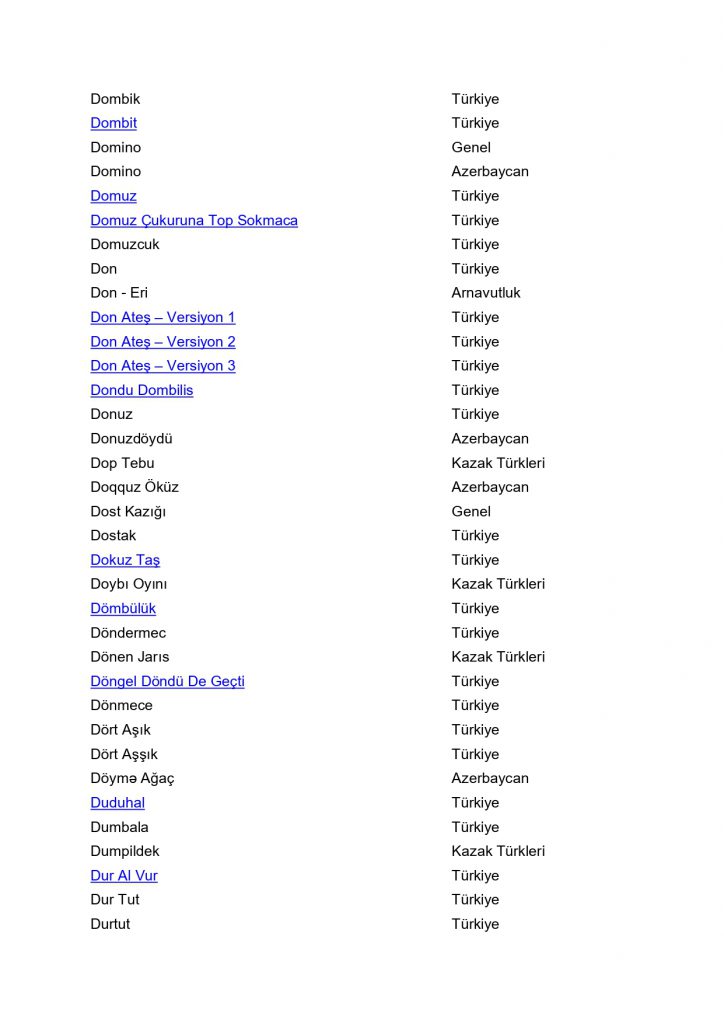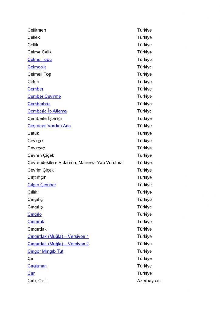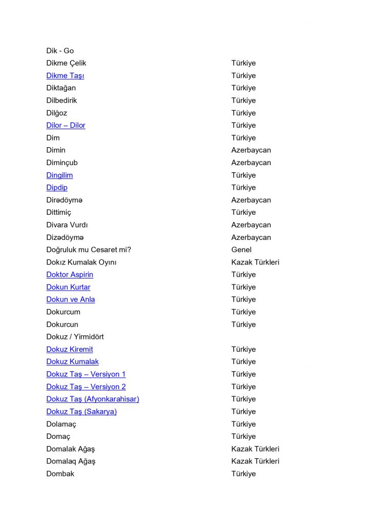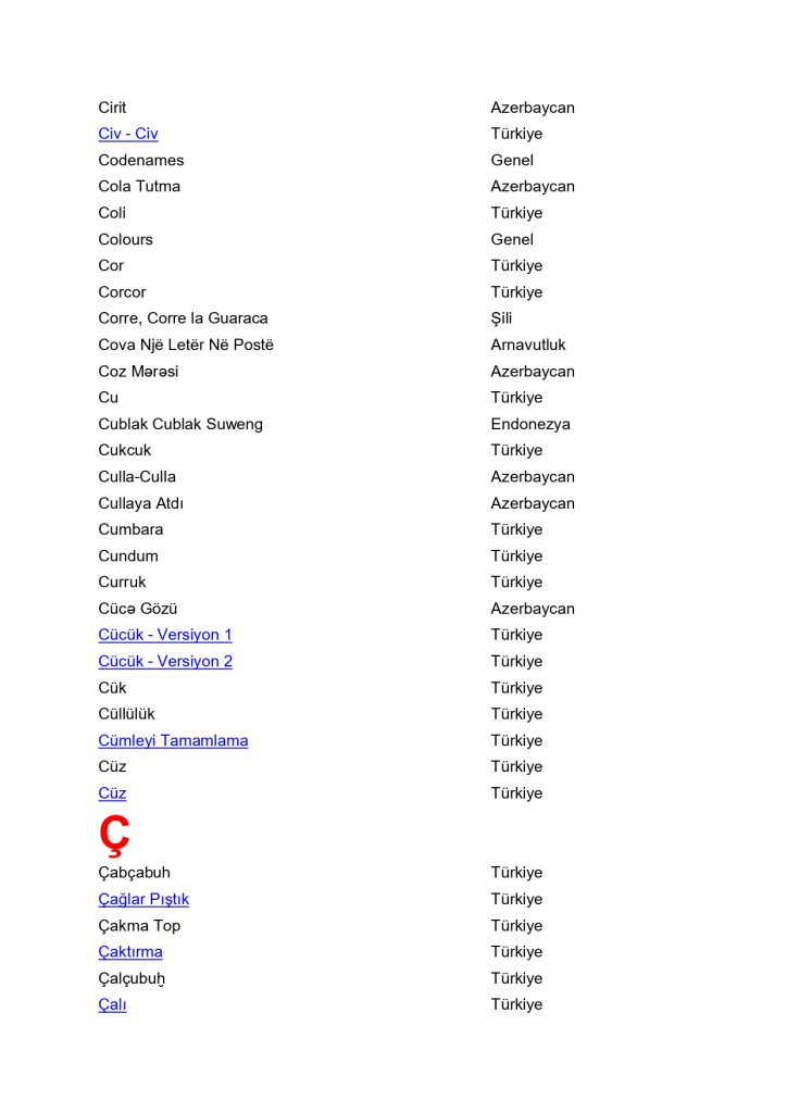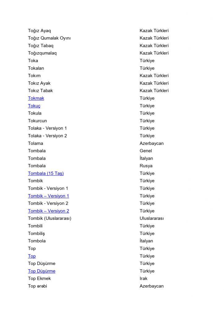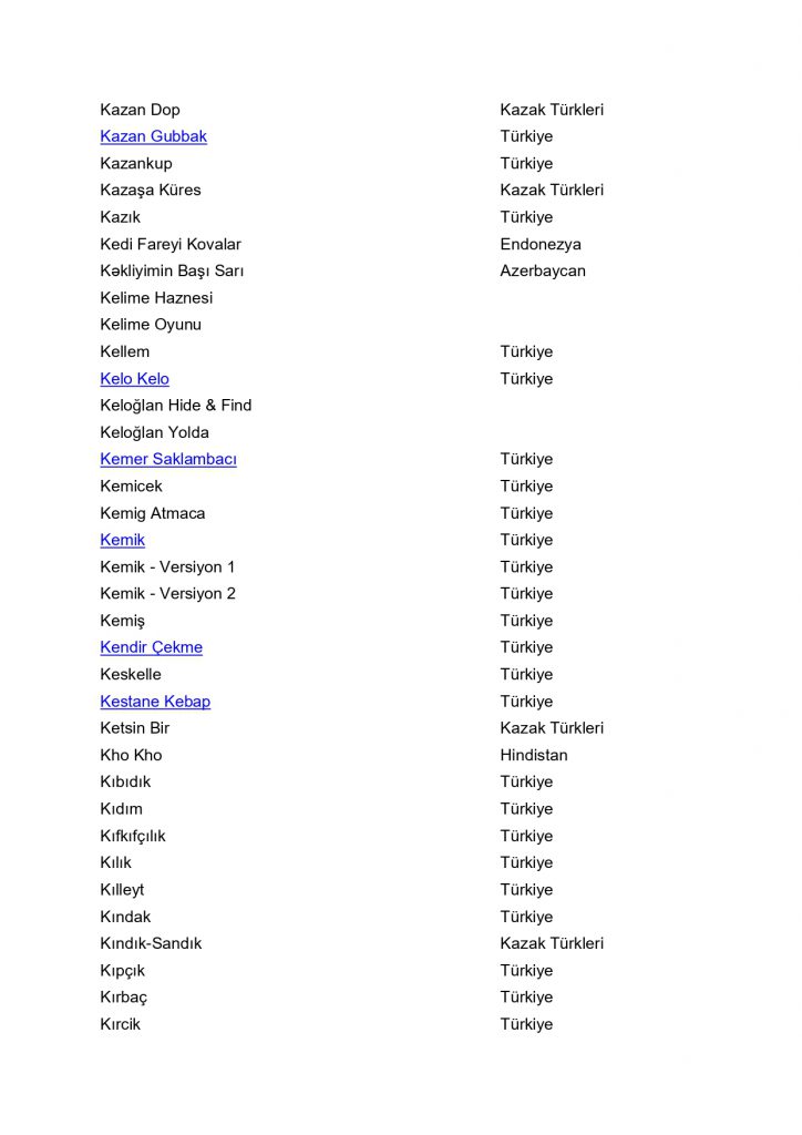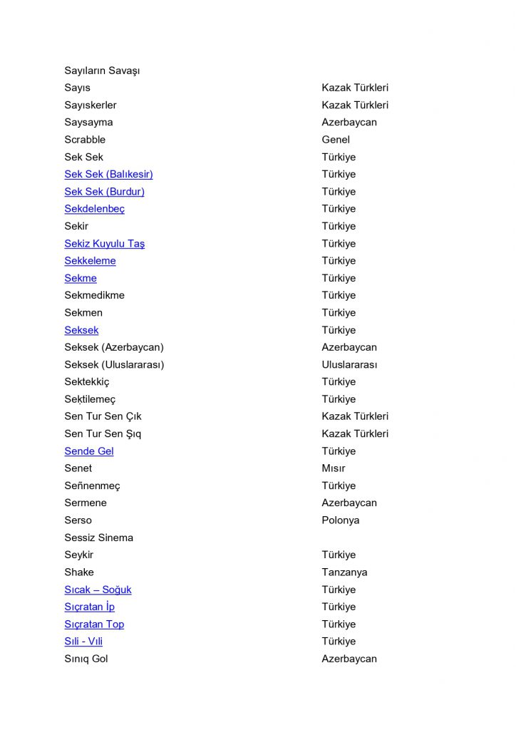 Taş İle Oynanan Oyunlar / Mani ve Tekerlemeli Oyunlar / Malzemeli Oynanan Oyunlar / Açık Alan Oyunları / Oyun