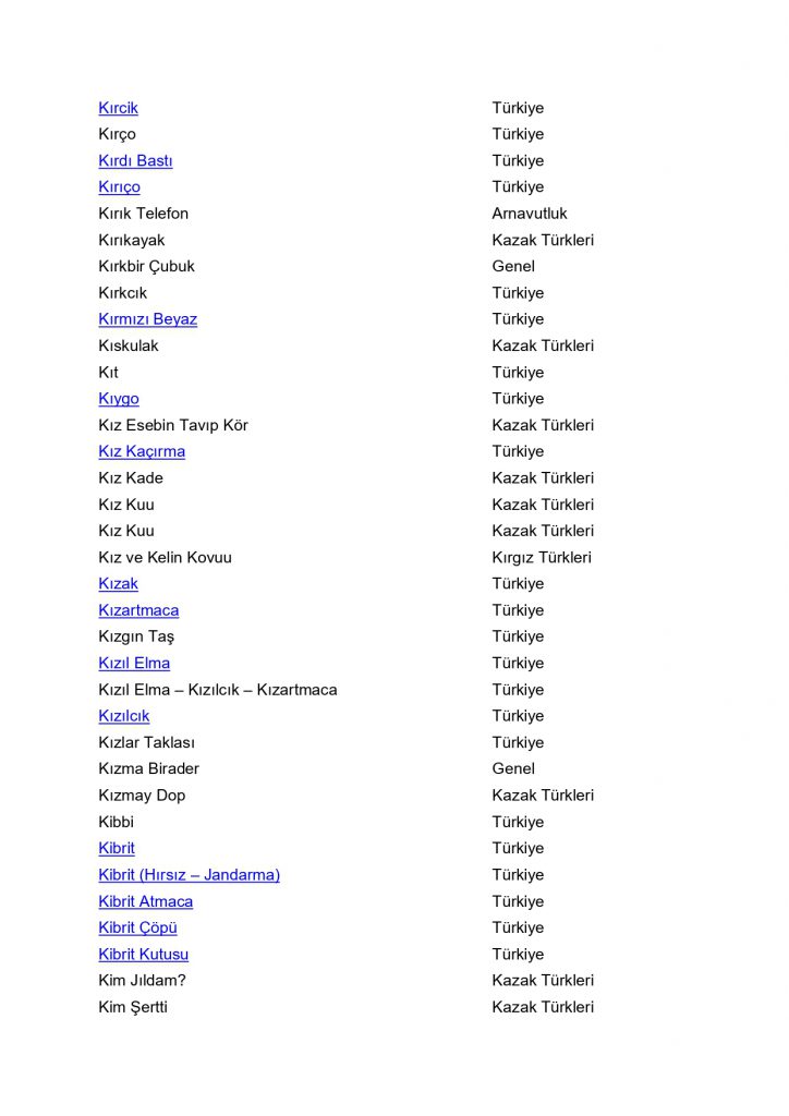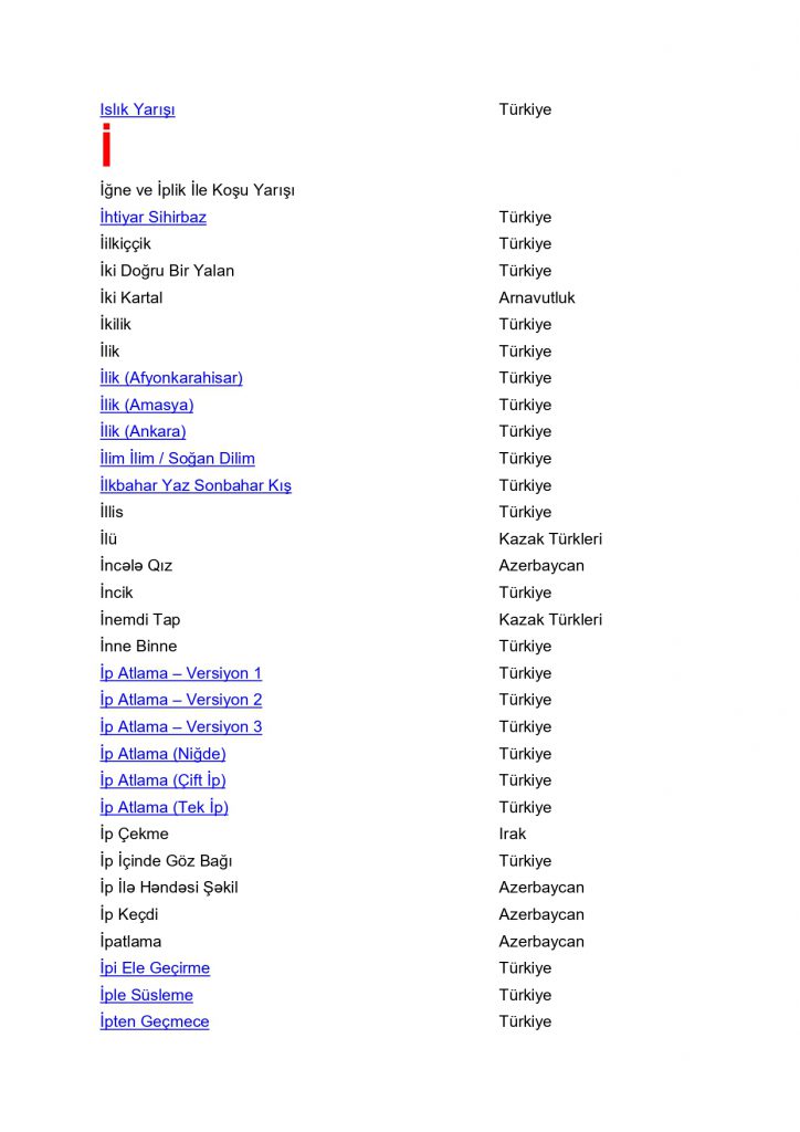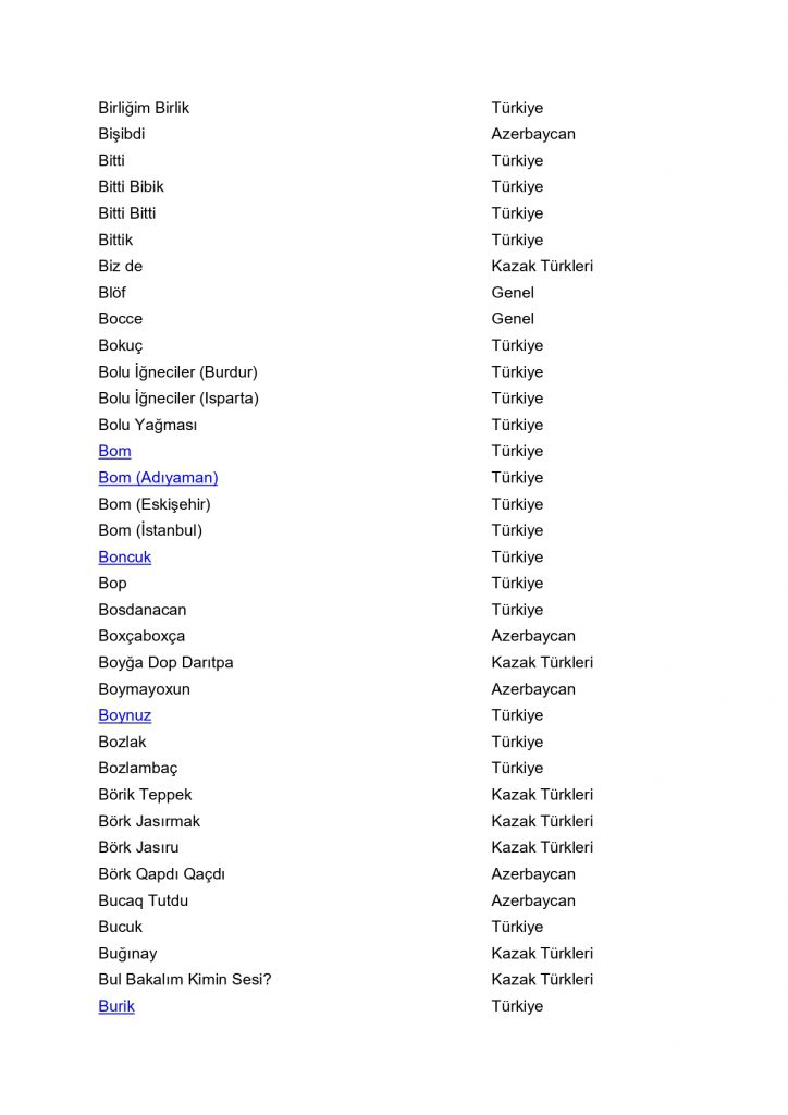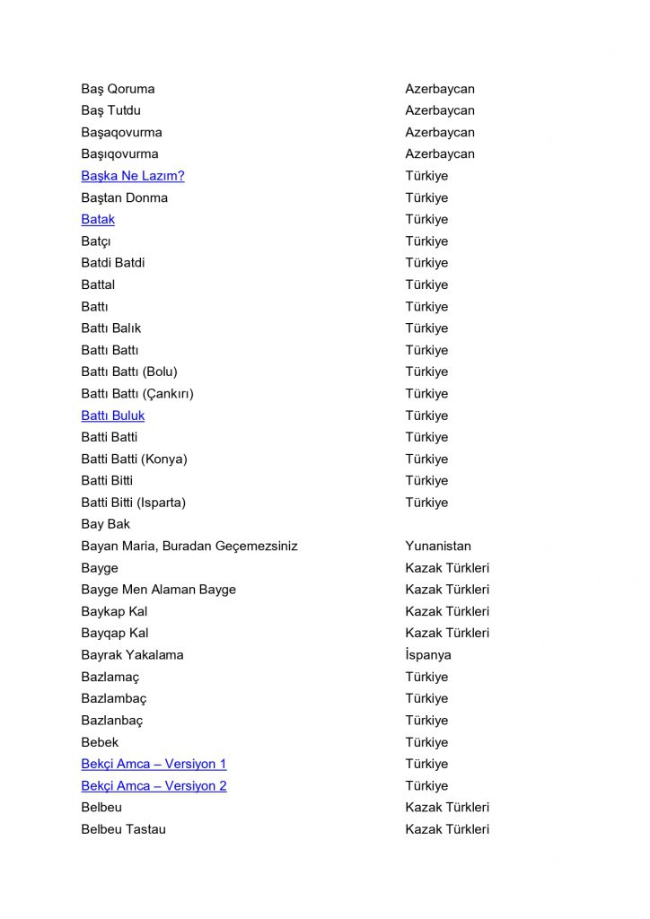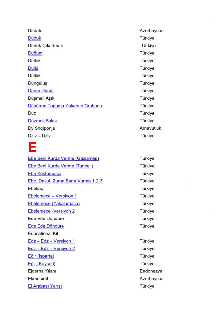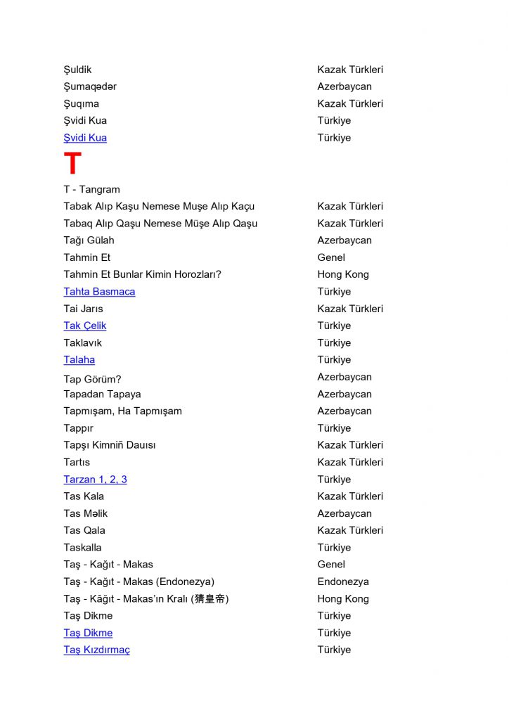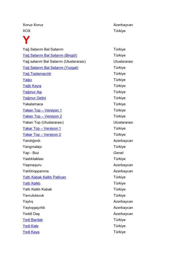 Taş İle Oynanan Oyunlar / Mani ve Tekerlemeli Oyunlar / Malzemeli Oynanan Oyunlar / Açık Alan Oyunları / Oyun