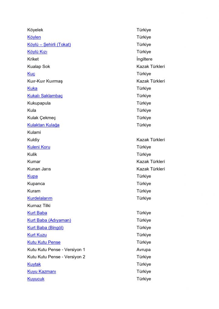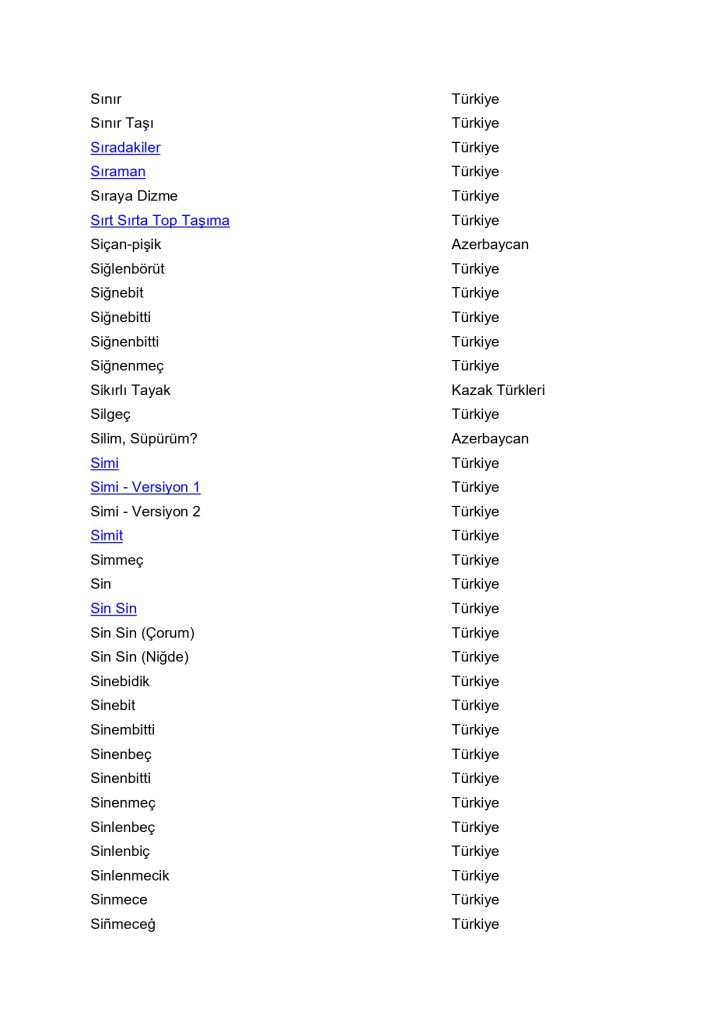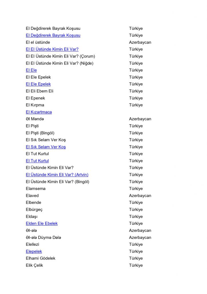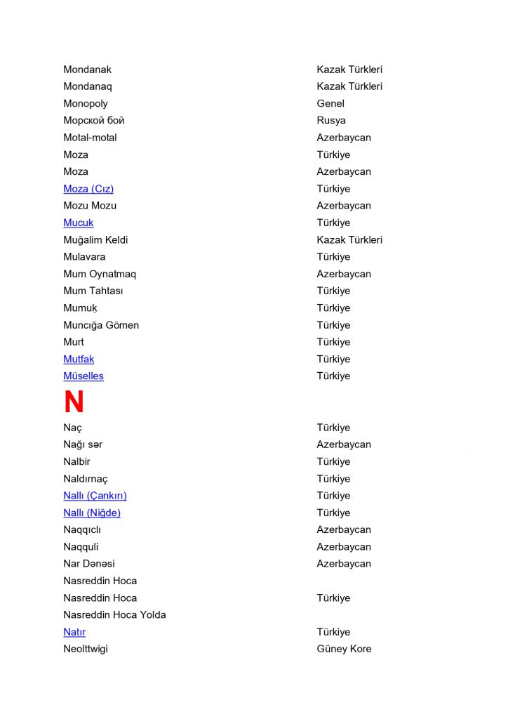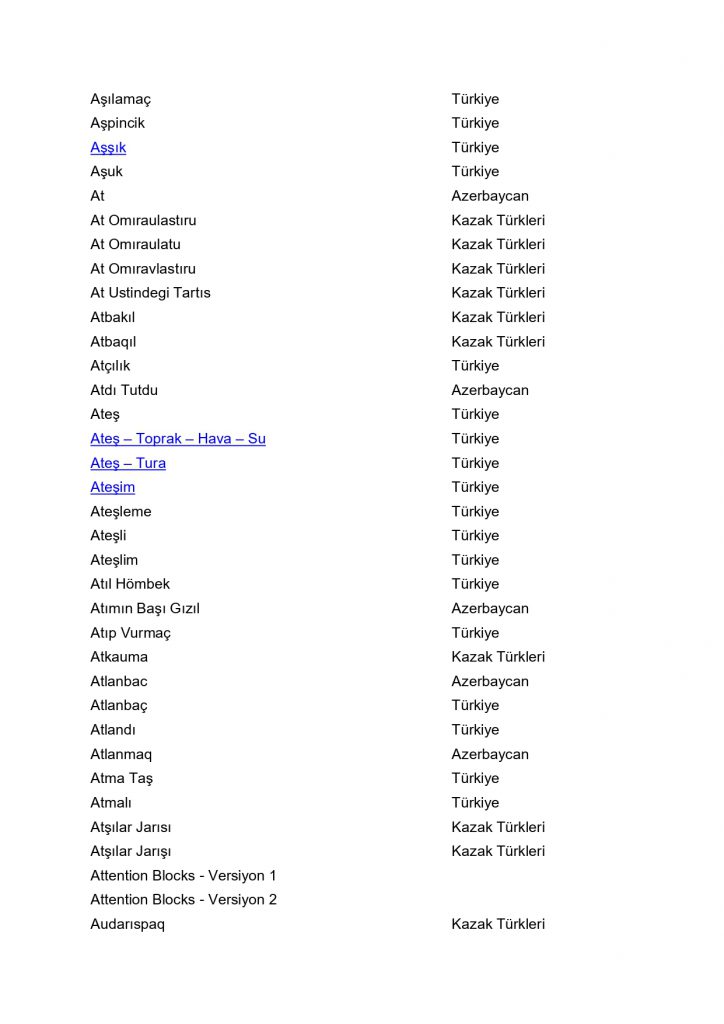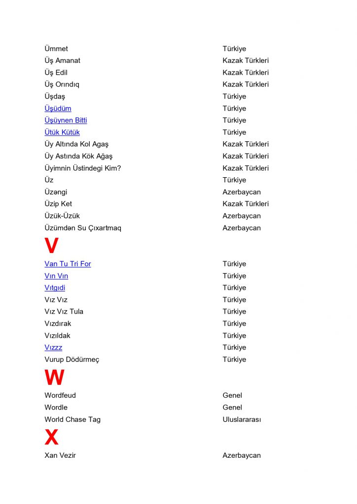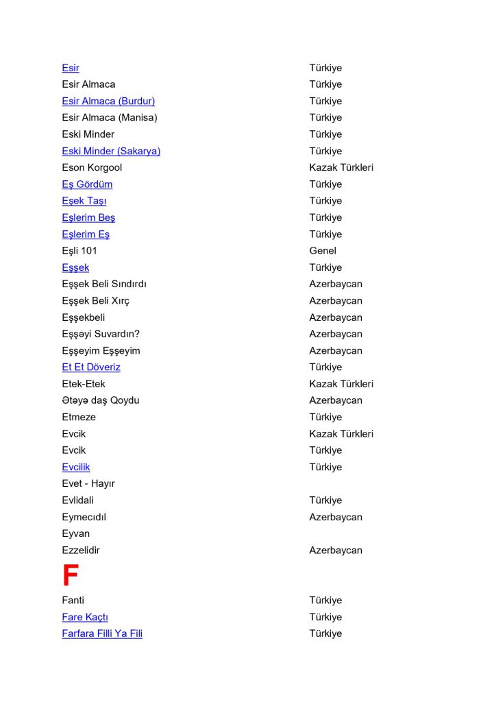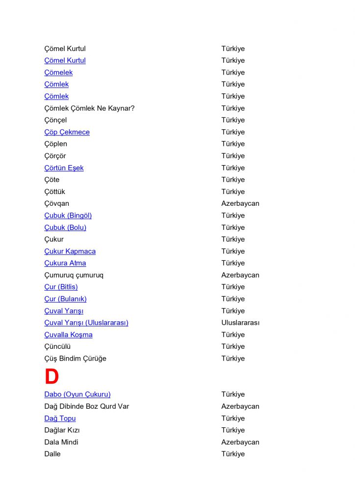 Taş İle Oynanan Oyunlar / Mani ve Tekerlemeli Oyunlar / Malzemeli Oynanan Oyunlar / Açık Alan Oyunları / Oyun