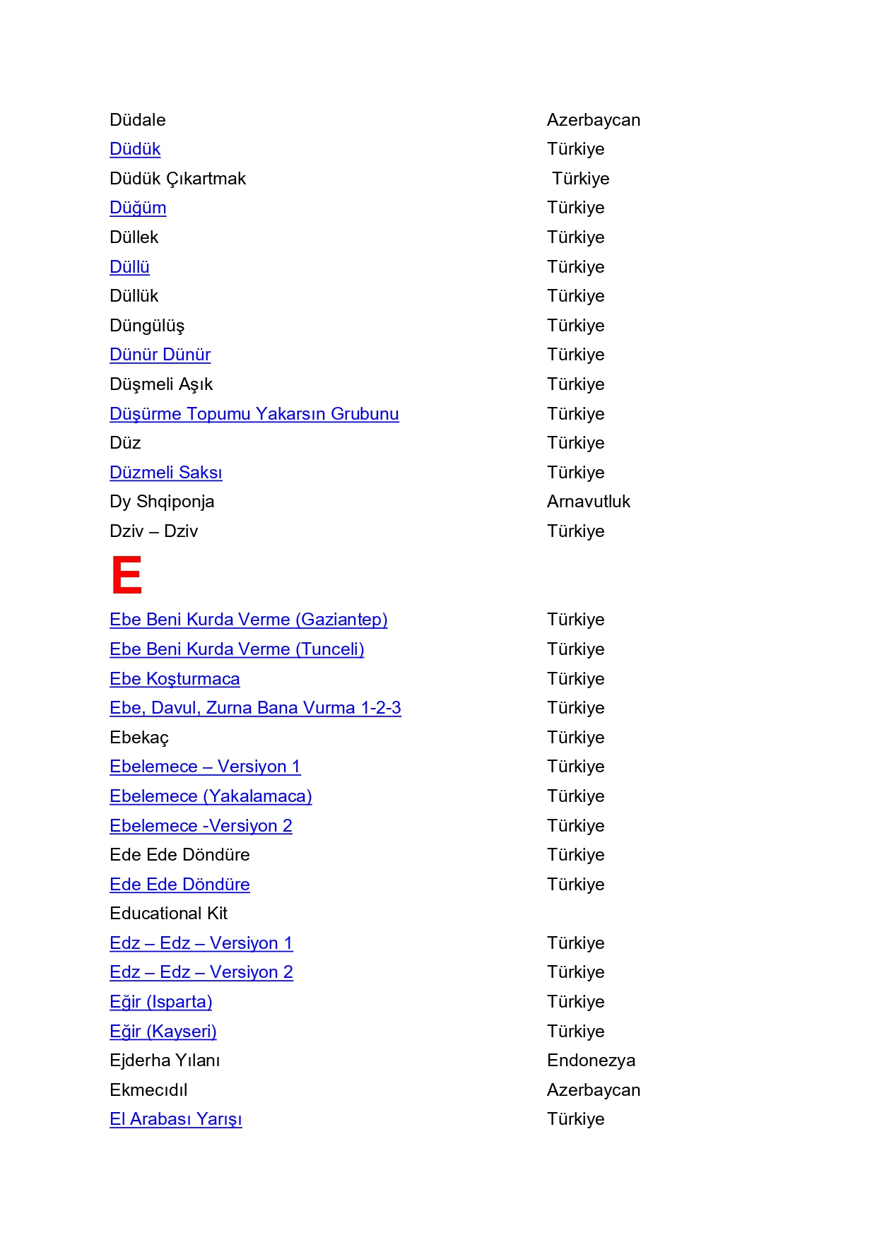 Taş İle Oynanan Oyunlar / Mani ve Tekerlemeli Oyunlar / Malzemeli Oynanan Oyunlar / Açık Alan Oyunları / Oyun
