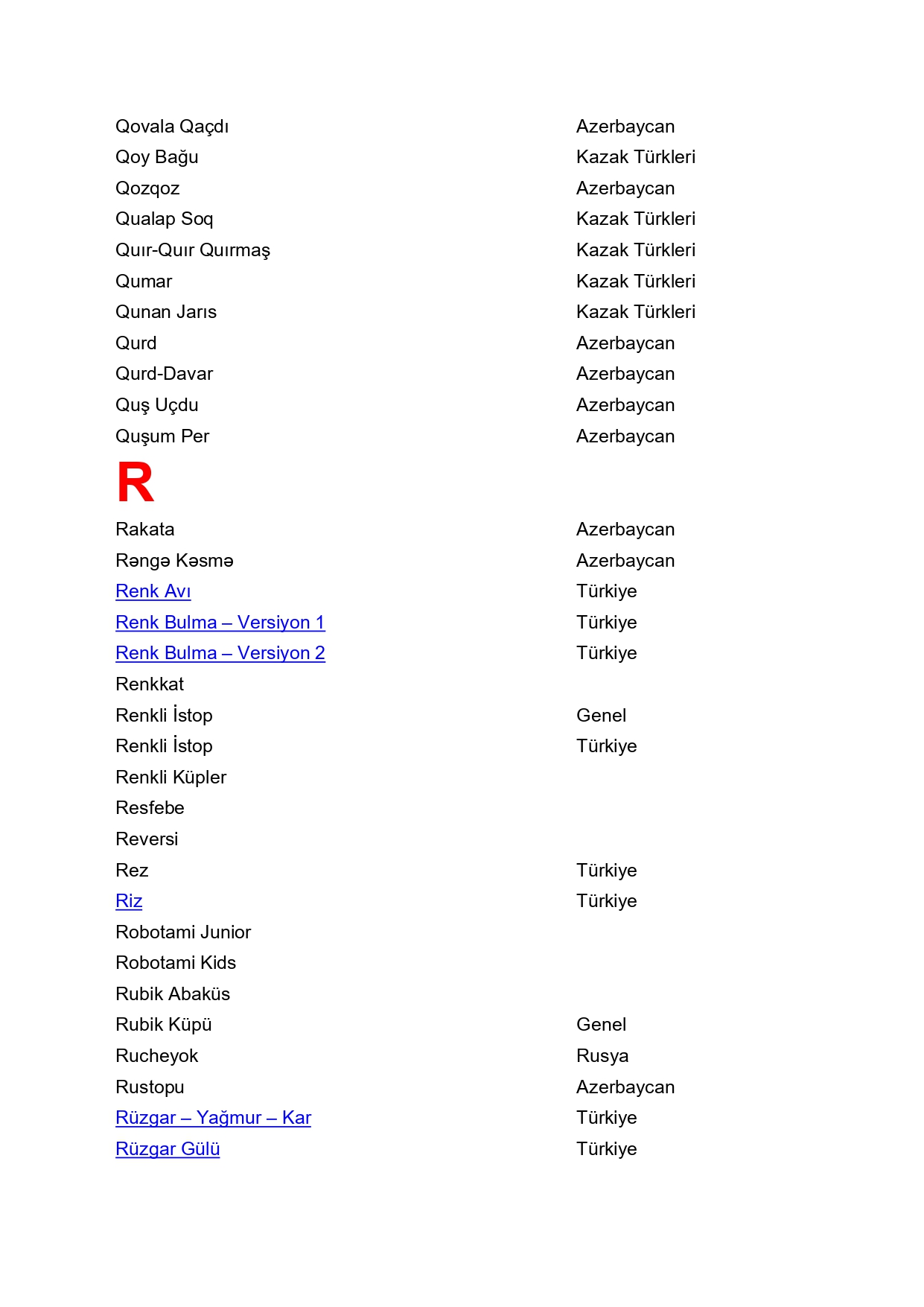 Taş İle Oynanan Oyunlar / Mani ve Tekerlemeli Oyunlar / Malzemeli Oynanan Oyunlar / Açık Alan Oyunları / Oyun